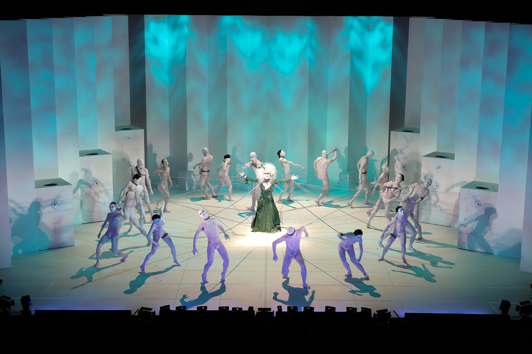 Pourtant, dans « Paradise », Akaji MARO semble laisser peu de place aux interprétations. En réfléchissant à ce nouveau spectacle dont le thème du Paradis était déjà trouvé, étrangement seuls des noms de maladies lui sont venus à l’esprit. Ce qui donne le ton de « Paradise » ! Le rideau rouge tombe ainsi sur un premier tableau « Nature » dans laquelle les danseurs sont enchaînés à un arbre, l’arbre de la connaissance, interprété par Akaji MARO. « Paradise » semble alors plutôt revisiter une partie de la Genèse de la Bible et plus particulièrement le mythe du Jardin d’Eden, le paradis terrestre. Akaji MARO revisite en effet le péché originel, où la femme n’est pas celle par qui tous les maux arrivent, mais il y délivre aussi un regard plein d’ironies, le tout sur des musiques composées par Keisuke DOI, maître de flûte shakuhachi, et par Jeff MILLS, pionnier de la techno à Detroit et avec qui Dairakudakan collabore régulièrement depuis 2013. Peu étonnant, car si Akaji MARO s’est penché sur le mythe du péché originel, c’est davantage pour une chose qui l’intrigue « le fait que l’homme a été banni du Jardin d’Eden au moment où il s’est montré curieux et a fait preuve d’intelligence. Depuis, il ne cesse de souffrir. Si l’homme était resté ‘bon et idiot’, ça n’aurait pas été ainsi. Selon moi, il est clair que l’homme est devenu malheureux en devenant intelligent. » ! Ce sont certainement pour ces mêmes raisons que la vision du Jardin d’Eden d’Akaji MARO semble aussi cauchemardesque que rêvée. Quoiqu’il en soit, si « Paradise » semble sujette à une interprétation plutôt claire, sa conclusion laisse les spectateurs partir en s’interrogeant sur la notion de bonheur voire même de liberté.