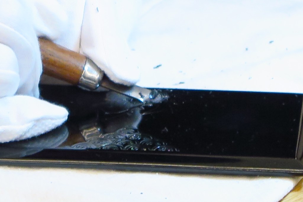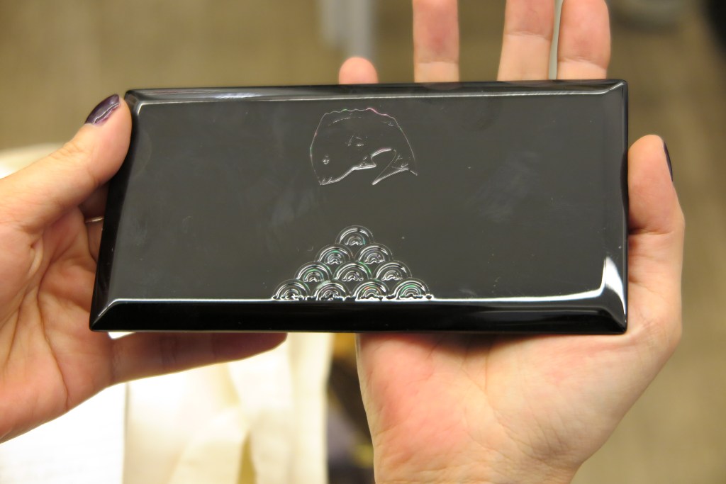Quand on parle de Takaoka shikki (soit « la laque de Takaoka »), il faut savoir que ce terme regroupe trois techniques spécifiques : Yusuke nuri (du nom de l’artiste Yusuke ISHII, employée durant l’époque Edo et qui n’est plus utilisée de nos jours), Chokoku nuri ( bois gravé laqué) et l’Aogai nuri (objet laqué avec de la nacre). C’est principalement cette dernière technique qu’a présenté Haruyuki SHIBATA, artisan de 3ème génération de l’atelier Shibata Shikki (fondé en 1925).