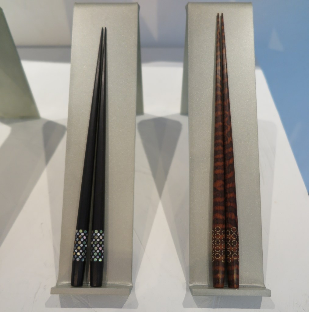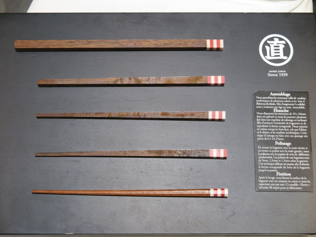 Il ne s’agit toutefois pas de simples baguettes ! Conscients que ces ustensiles servent à nourrir les clients, Marunao fabrique leurs baguettes dont les pointes sont rabotées pour être de forme octogonale afin de favoriser une meilleure prise des aliments. Les pointes sont aussi si finement rabotées, jusqu’à 1,1mm pour la gamme Premium, que l’utilisateur en oublierait qu’il porte des aliments à sa bouche avec des baguettes. Un autre point très important au cœur de leur artisanat est le choix du bois, tous importés déjà coupés de l’étranger, qu’il s’agisse d’ébène ou encore de bois de rose. Le président de Marunao nous explique que c’est en raison du besoin d’un bois dur et solide afin d’éviter que les baguettes se cassent facilement. Il faut dire que le processus nécessite plusieurs étapes essentielles pour obtenir un produit final sobre tout en étant très raffiné, quelle que soit la gamme des produits. Précisons alors que les bois utilisés sont du bois coupé 30 ans auparavant, nécéssitant plusieurs (longues) phases de séchage avant même sa transformation.