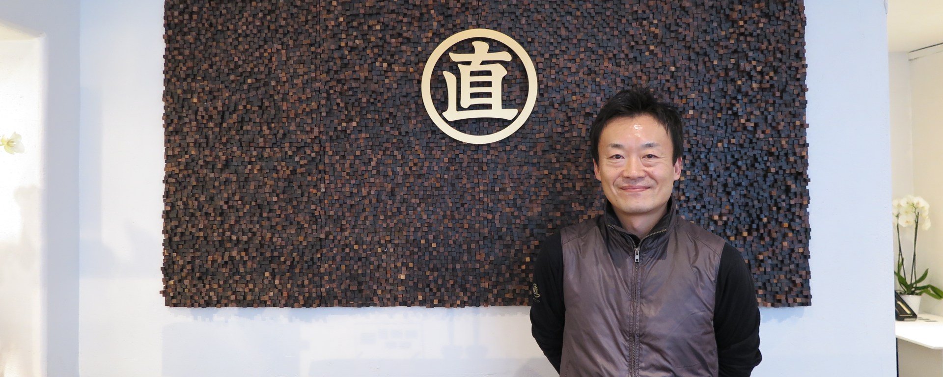 Photo : Takahiro Fukuda, président de Marunao, pose devant le symbole de la marque.