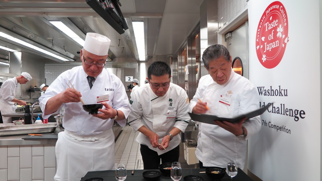 Quant au jury, il était composé d’ ambassadeurs de la cuisine japonaise : Yoshihiro MURATA, propriétaire et chef des restaurants Kikunoi (deux établissements à Kyôto et un à Tôkyô, et tous étoilés au Guide Michelin) et président du Japanese Culinary Academy ; Masahiro NAKATA, directeur de l’école Taiwa Gakuen Education et président du Kyoto Culinary Art College et Hideaki MATSUO, chef et propriétaire du restaurant Kashiwaya (étoilé au Guide Michelin à Osaka). Pour la dernière épreuve, un dernier juge était présent et il s’agissait de Yoshio KOJIMA, comédien et promoteur actif de la production agricole, forestière et de la pêche du Japon, le concours étant organisé par le ministère japonais de l’Agriculture, de la Forêt et de la Pêche.