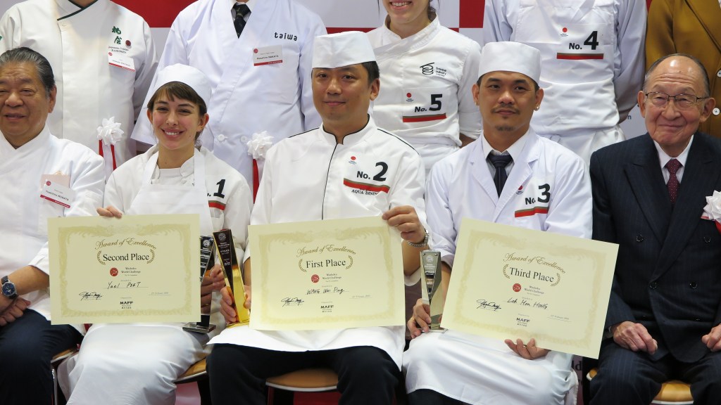 Visiblement, il a été difficile de choisir le vainqueur de ce 7ème tournoi puisque d’après le président du jury Yoshihiro MURATA, le niveau était très homogène entre tous les participants et il aurait souhaité que tous soient vainqueurs. Il fallait cependant choisir un lauréat et après avoir adressé ses remarques sur les réalisations de chaque candidat, le top 3 de ce Washoku World Challenge est donné :