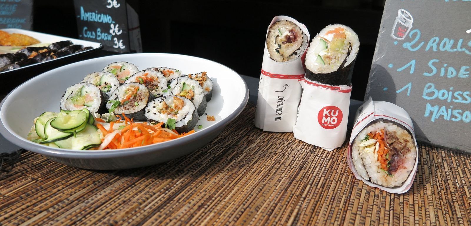 Paris est enfin déconfinée et nous pouvons reprendre nos activités petit à petit ! Notre premier arrêt vers ce progressif retour à la vie : la Kantine by Kumo aux abords du Canal Saint Martin. Ouvert dès le 1er juin, l’établissement éphémère vous accueille jusqu’à la fin du mois de juillet avec un menu très alléchant. Derrière la Kantine, se trouve l’équipe de Kumo, fondé par Antoine BUNGERT et Gaspard LUCIANO, qui avait lancé en 2017 ses distributeurs de rolls pour proposer une offre de déjeuner pour les étudiants et les salariés à bas prix mais avec des produits de qualité. Les rolls sont alors directement inspirés des sushi-burritos très en vogue en Californie. C’est cette même inspiration, mais avec un accent plus poussé sur la cuisine japonaise que l’on retrouve dans leur nouveau projet, à la Kantine. Les habitués des rolls de Kumo peuvent les retrouver à travers de nouvelles recettes pensées pour la Kantine.