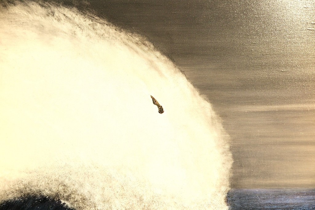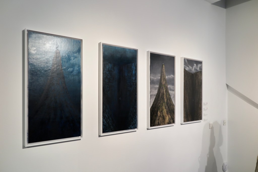 Les femmes nues, caractéristiques de ses œuvres, sont bien présentes, représentées seules face à leur environnement. Une manière de pousser davantage à une introspection individuelle, mais aussi peut-être un indicateur selon lequel il s’agit d’une exposition très personnelle, représentative des réflexions de l’artiste ? Une grande force des travaux de Shiori EDA est que ses œuvres, bien que figuratives, sont ouvertes à l’interprétation. Si l’on observe attentivement les tableaux de Genèse, on y voit successivement une femme plongée dans les abîmes de l’océan, et à côté, à l’inverse, une femme nageant, flottant à la surface tandis qu’au premier plan on remarque les profondeurs d’une étendue d’eau, dans lesquels nous pouvons y lire un conflit intérieur entre désespoir et liberté, cette dernière étant symbolisée par cette femme nue face à l’immensité de la nature. Une manière peut-être pour l’artiste de dévoiler ses interrogations sur la condition féminine ?