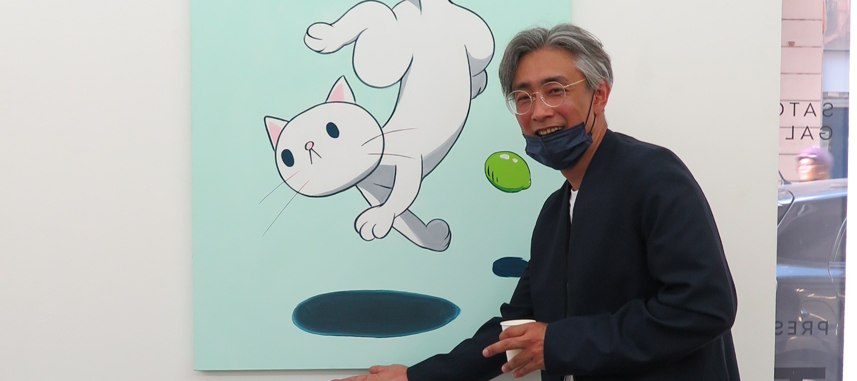 Photo : Takeru Amano pose devant une de ses œuvres au vernissage de 2021 : A Space Odyssey ©Japan Exclusive
