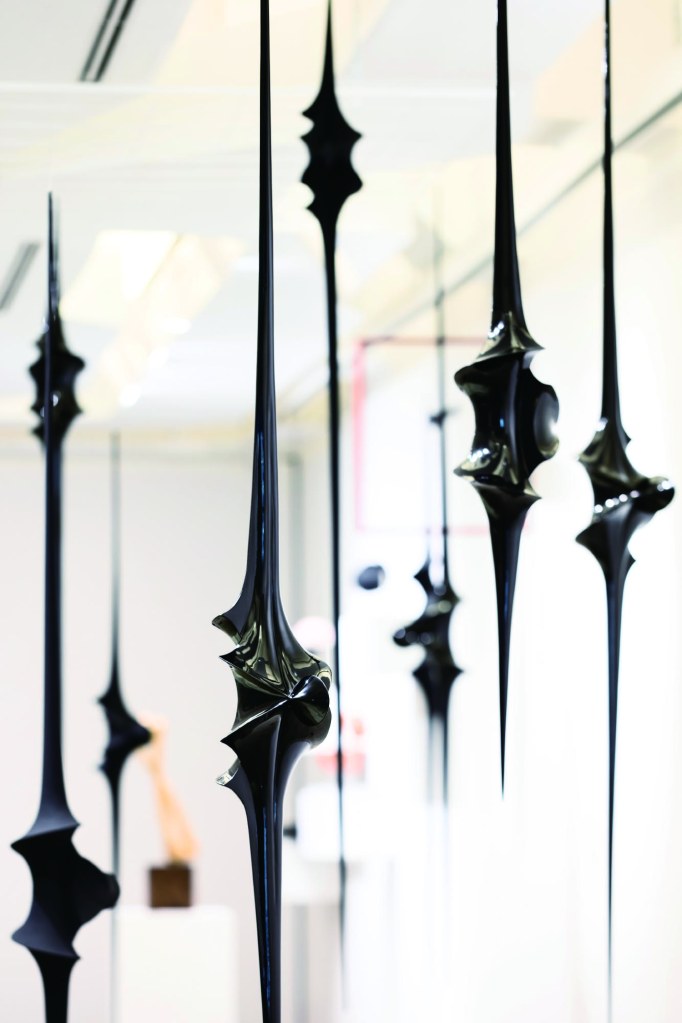 Toshimasa KIKUCHI est un artiste contemporain japonais né en 1979. Mais il est probable, si vous vivez à Paris ou plus largement en Île de France, que vous ayez déjà aperçu certaines de ses œuvres puisqu’il était exposé lors du dernier Asia Now. L’artiste est par ailleurs également exposé en ce moment à la Galerie Mingei, Paris 6ème, jusqu’au 30 juillet. Issu d’une formation de conservation et de restauration des arts bouddhiques, il est également chercheur au musée de l’Université de Tôkyô. S’il maîtrise les techniques de sculpture et de laque traditionnels japonais, il s’inspire des objets mathématiques et des Equations Shakespeariennes de Man Ray, pour créer des sculptures laquées dans des formes géométriques et abstraites et dont la mise en scène fait penser à des stalactites. Toshimasa KIKUCHI fait coexister arts, sciences, innovation et tradition dans une installation d’une vingtaine d’œuvres intitulée Needles, installée dans la rotonde du 4ème étage du musée.