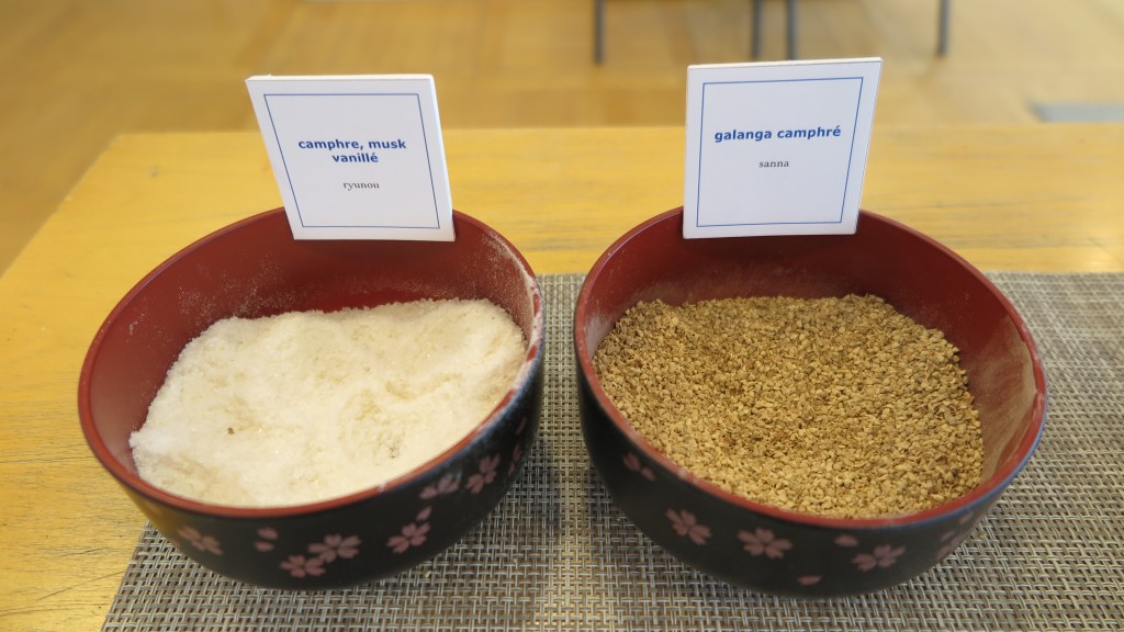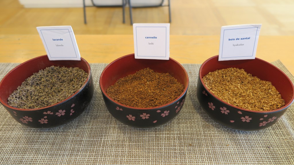 Avant de poursuivre sur cet atelier, il faut savoir ce qu’est le parfum au Japon ! Si vous êtes déjà allés là-bas, vous avez peut-être remarqué que les Japonais portaient très rarement du parfum ? C’est parce que la culture du parfum est très différente, les Japonais considérant que sentir l’autre est une nuisance. Un terme a même été donné, celui kôsui kôgai ou « pollution au parfum » ! Il faut savoir que le parfum, tel que nous l’utilisons en Occident, a été introduit à l’Ouverture du Japon à l’ère Meiji. En revanche, cela ne signifie pas que les parfums n’existaient pas jusqu’alors dans ce pays. Bien au contraire, il y a un usage des parfums à travers l’encens, présent depuis des siècles au Japon et qui a même été codifié à travers l’art du kôdo. Ainsi, le parfum ne se porte pas vraiment sur les personnes mais est destiné à l’intérieur des maisons ! Surtout, le parfum a différentes fonctions comme désinfecter ou repousser les insectes, grâce aux ingrédients employés. Toutefois, si les Japonais n’ont pas pour coutume de s’asperger de parfum, il existe une autre façon, plus subtile, de se parfumer en plaçant un sachet de nioi bukuro, qui signifie littéralement « sachet parfumé », contre sa poitrine, diffusant délicatement une fragrance. Ces sachets sont également traditionnellement placés dans des armoires ou dans des tiroirs afin de parfumer les vêtements. De plus les sachets sont souvent réalisés à partir de tissus traditionnels, leur donnant un attrait supplémentaire. Quant aux parfums, ils sont fabriqués à partir des mêmes ingrédients utilisés dans la production d’encens. De nos jours, c’est principalement à Awaji que sont produits les encens et parfums japonais. Depuis quelques années, nous pouvons en trouver quelques marques en France que ce soit à travers la marque hibi, ou les importateurs comme Ars Incense Japan ou encore sur la boutique en ligne de l’exposition Synergies entre tradition et modernité !