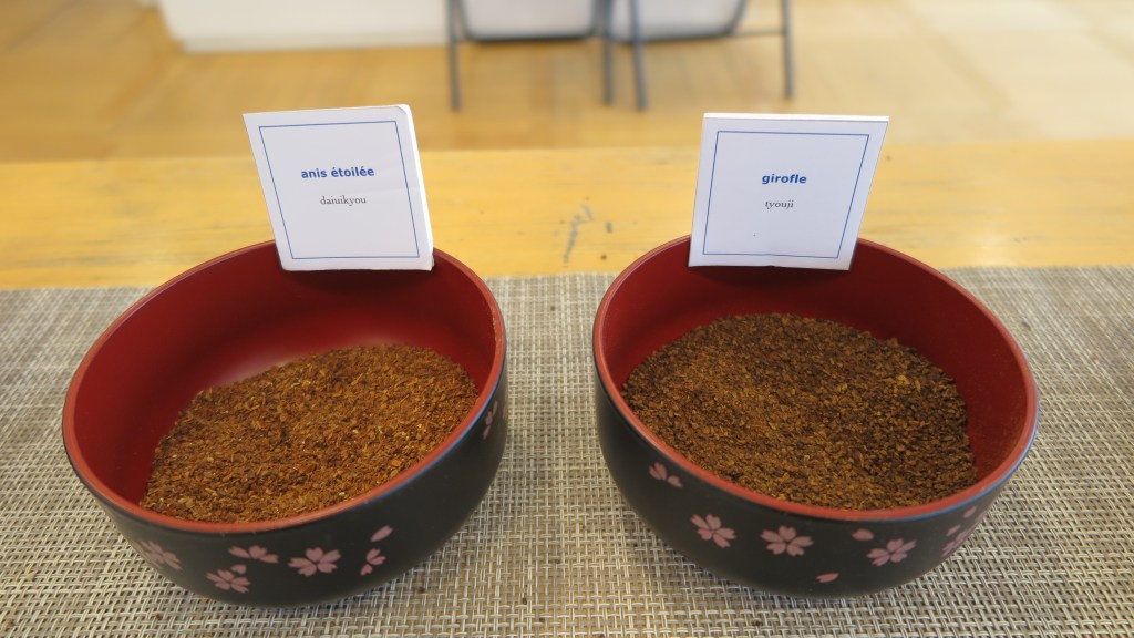 Revenons à notre atelier, Lucas BOLLINGER était donc notre enseignant. Durant une quarantaine de minutes, les participants étaient invités à créer un sachet parfumé à partir de 7 ingrédients : cannelle, lavande, bois de santal, anis étoilé, girofle, camphre et musc vanillé, et galanga camphré. En réalité il existe d’innombrables sortes d’ingrédients pour créer une senteur. Mais pour un début, nous avions été limités dans les choix, avec raison. En effet, les participants devaient réaliser leur nioi bukuro à l’aide de ces 7 ingrédients, sans obligation de tous les intégrer. Il s’agissait plutôt d’essayer de composer un parfum en utilisant les ingrédients désirés et en les dosant à l’aide de notre odorat, le tout munis d’un petit contenant et d’une cuillère. Et rien qu’avec 7 senteurs différentes, on peut créer de nombreuses combinaisons et il a été difficile de parvenir à équilibrer les ingrédients et obtenir la fragrance désirée ! Mais pour finir, nous sommes repartis avec un nioi bukuro personnalisé.