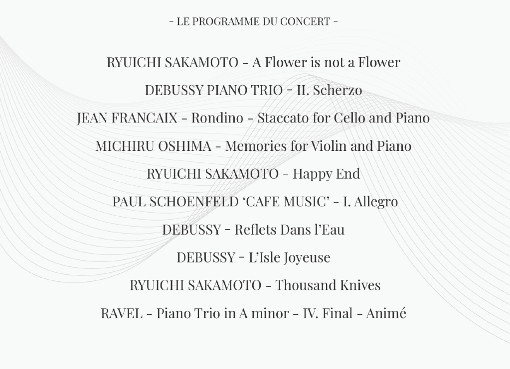 C’est également dans le choix des musiciens interprètes, ou plutôt musiciennes interprètes, que ce voyage musical se reflète. C’est un concert de musique de chambre, donc en petit comité, et pour GOKAN ce seront trois femmes qui interprèteront le programme : la pianiste Rieko TSUCHIDA, la violoniste Aiko OKAMURA, et la violoncelliste Julie SEVILLA-FRAYSSE.