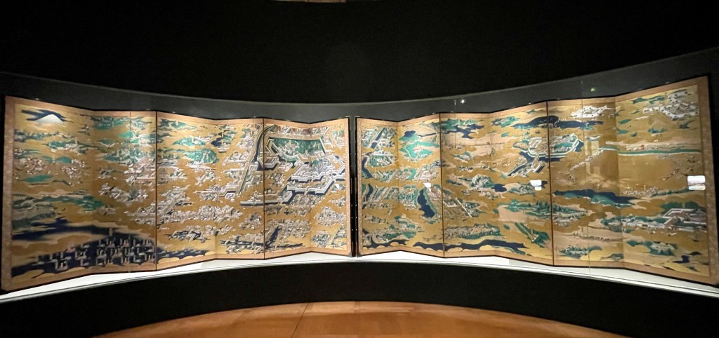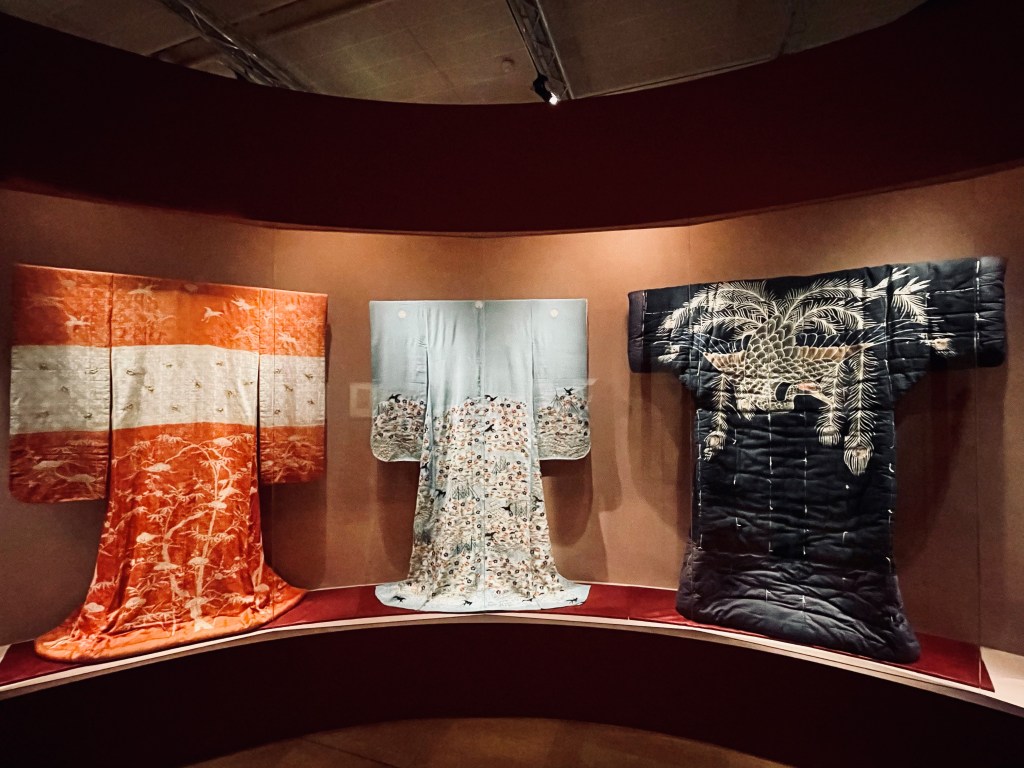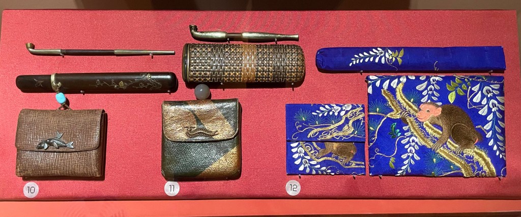 Enfin, les animaux sont représentés dans les arts décoratifs, et c’est à titre personnel, ma section préférée de cette exposition, et ce, malgré les nombreuses estampes et rouleaux qui valent le détour. Vous avez l’occasion d’admirer trois splendides kimonos et accessoires dans le thème de l’exposition. Car c’est durant cette époque, que les motifs décoratifs apparaissent sur les kimonos, puis sur des accessoires. Les motifs représentent des animaux ou la flore symboliques d’une saison ou représentent un symbole pour attirer la chance ou le bonheur.