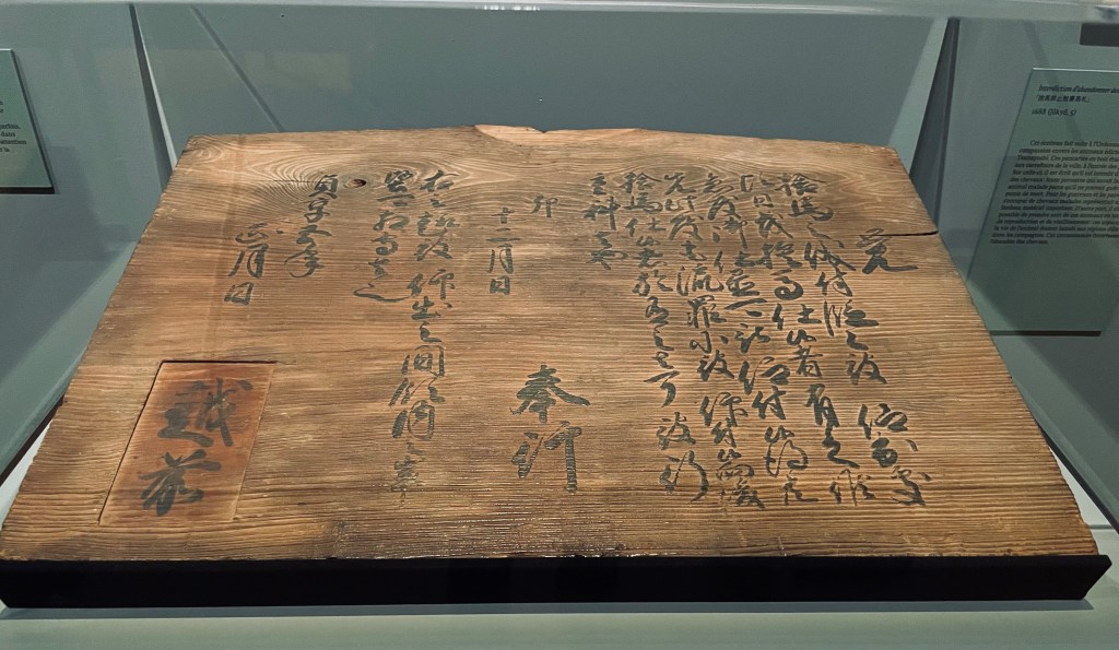 Un bestiaire japonais permet de visualiser ce respect porté vers la nature dans la vie quotidienne des Japonais, en atteste par exemple cette fascination pour le chant des grillons l’été. Dans la partie consacrée aux animaux sauvages, on peut voir des œuvres montrant un recensement des espèces animales vivant dans Edo : tanuki (sorte de raton laveur), écureuils, faisans, hiboux ou encore belettes…. Bien sûr l’exposition s’intéresse également aux animaux domestiques, et s’il est plutôt récent de s’intéresser en Occident aux rapports entre humains et animaux, et plus particulièrement le bien-être animal, il semble qu’au Japon, la population s’y intéresse dès le XVIIème siècle. Dès le début de l’époque Edo, une ordonnance sur la compassion envers les animaux a été édicté par le Shôgun TSUNAYOSHI. Des pancartes en bois sur lesquelles étaient gravées l’ordonnance étaient présents un peu partout dans les villes. Il était alors interdit d’abandonner un cheval quel que soit le prétexte, et plus particulièrement, il était interdit d’abandonner un cheval malade, auquel cas son propriétaire était passible de la peine de mort.