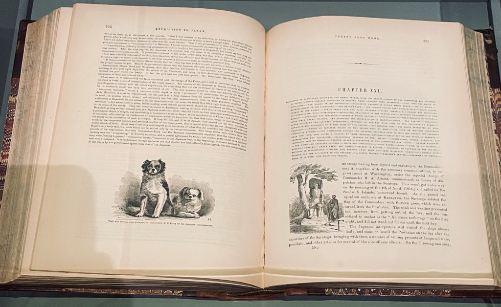 Quant aux animaux de compagnie, c’étaient davantage des chats et des poissons rouges qui faisaient partie des foyers en ville. On relève ainsi plusieurs représentations de chats dans plusieurs estampes exposées à la MCJP. Rares sont les chiens. Si on peut constater dans notre époque actuelle une popularité intense à travers le monde autour de quelques races de chien typiquement japonais, à l’instar du Shiba Inu, il en existe d’autres au Japon dont certaines sont devenues populaires à partir de l’époque Edo, à commencer par le Chin ou épagneul japonais. Ce dernier est une race importée de Chine durant l’époque Nara (710-794), mais à l’époque Edo, seules certaines familles aristocratiques ou des familles de Seigneurs peuvent adopter un chien. Ailleurs dans le monde, le chien est plus répandu au sein des foyers et cet animal devient alors un cadeau diplomatique ! Lors de l’ouverture forcée du Japon par le Commodore PERRY, le Shôgun offre deux chin nommés Edo et Shimoda à Matthew PERRY. Il les ramènent à New York avec lui et grâce à cela, les épagneuls japonais deviennent populaires en dehors du Japon !