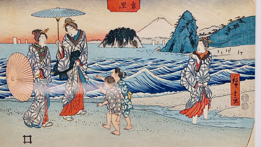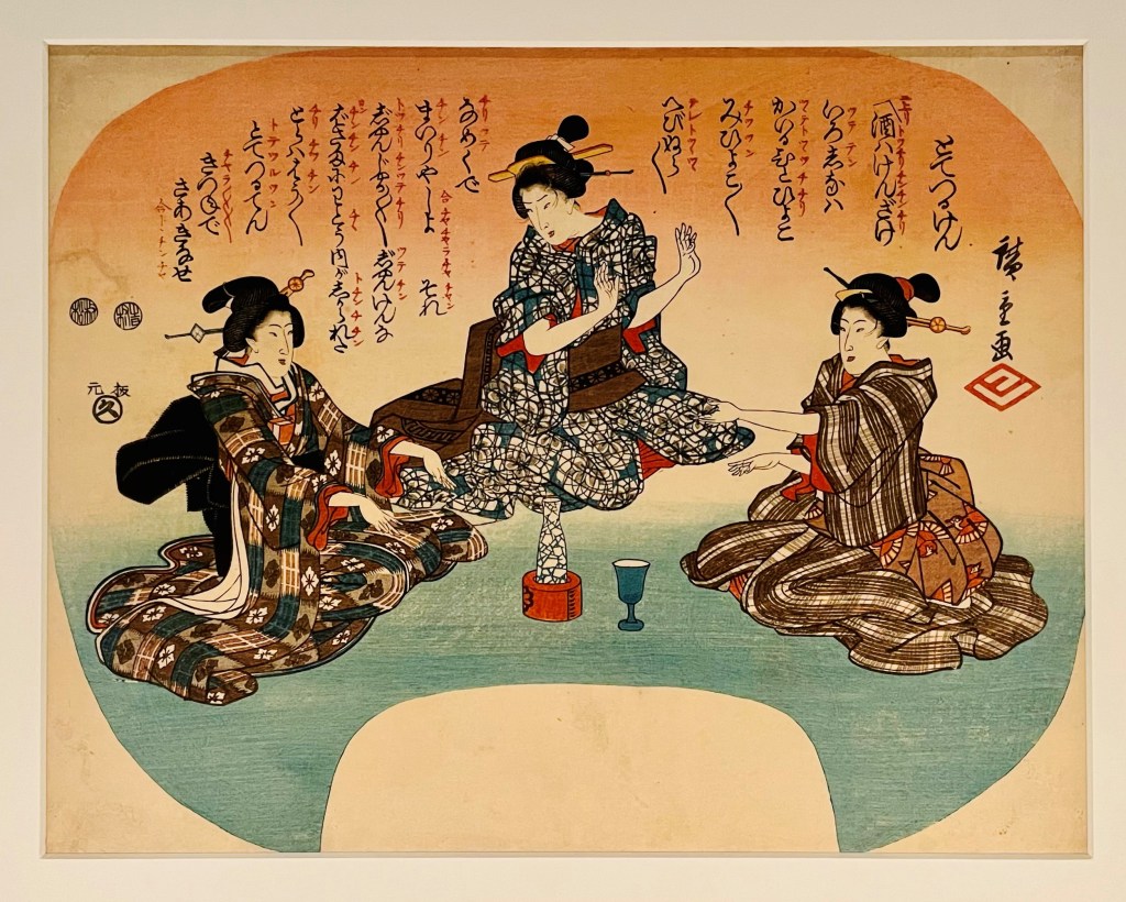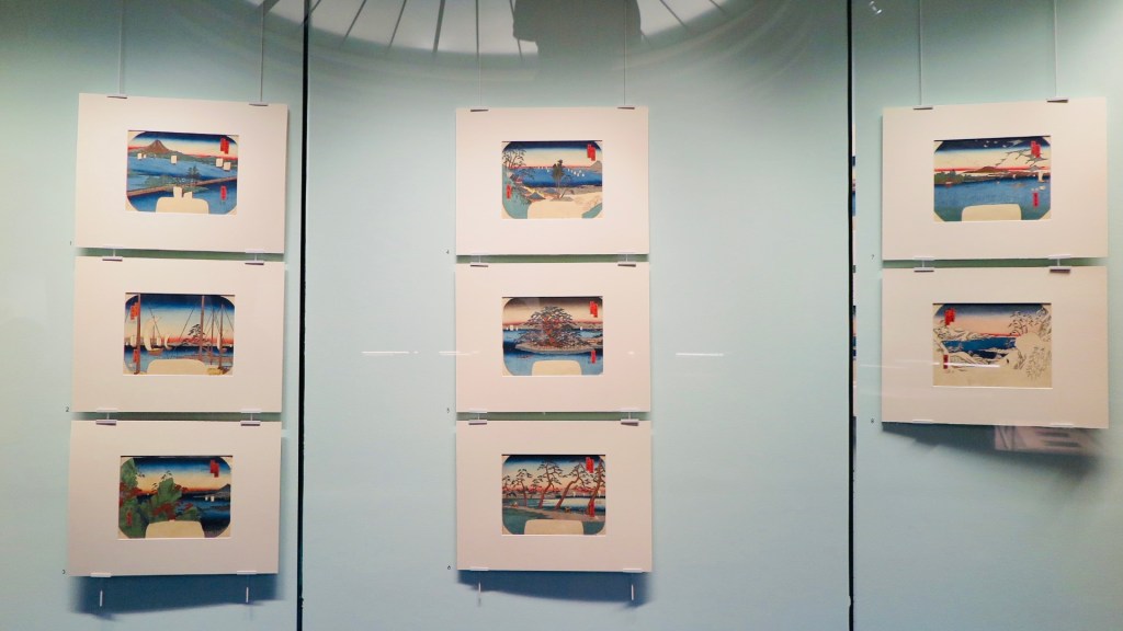 Dans Hiroshige et l’éventail, on retrouve une centaine d’œuvres dont la majorité est issue de la collection de Georges LESKOWICZ. Sur ces estampes, qui précisons-le ici sont dans un très bon état car il s’agirait de modèles non découpés et restés intacts, on retrouve les thèmes privilégiés par UTAGAWA Hiroshige, rassemblés dans cette exposition en 6 catégories : les paysages d’Edo et d’autres provinces japonaises comme une série complète des Huit vues d’Ômi – des paysages entourant le lac Biwa de l’ancienne province d’Ômi, aujourd’hui département de Shiga, des portraits de femmes et de leur quotidien comme une description d’un Jeu de main Totetsuruken, représentations de la faune et de la flore, sujets historiques, de la littérature et du théâtre où on retrouve des estampes issues de la série des Trente-six génies féminins de la poésie – un groupe réunissant des poétesses ayant vécu entre le IXème et le XIIème siècle et un thème artistique très représenté au cours de l’époque d’Edo, et enfin des estampes parodiques à l’image de La danse de la fête des morts (Bon Odori) qui est une des rares danses représentées par Hiroshige. C’est donc définitivement un « voyage dans le Japon du XIXème siècle » que nous propose le MNAAG à travers Hiroshige et l’éventail. Voici, ci-après, un florilège en photo de cette exposition à ne pas manquer !