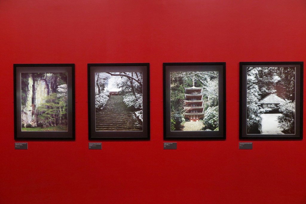 - Sur la route des temples anciens : C’est une série de photographies principalement en couleur qui dénotent en opposition aux photographies en noir et blanc qui composent une grosse partie de cette exposition parisienne. La MCJP souligne le contraste en installant cette série de photos sur un fond rouge vibrant. Là encore c’est un sujet de photographie de longue date ! C’est le temple Muroji (département de Nara), qu’il commence à photographier dès 1939, qui semble le fasciner le plus. Cette dernière partie permet de visualiser comment à son époque Ken DOMON a documenté les structures des temples et les sculptures bouddhiques, mais surtout de constater l’évolution technique du photographe, victime de plusieurs hémorragies cérébrales, une 1ère dès 1959 et une 2ème en 1968. Hélas, ses soucis de santé le laissent de plus en plus diminué mais jamais il n’abandonnera la photographie, s’adaptant alors afin de poursuivre son travail.