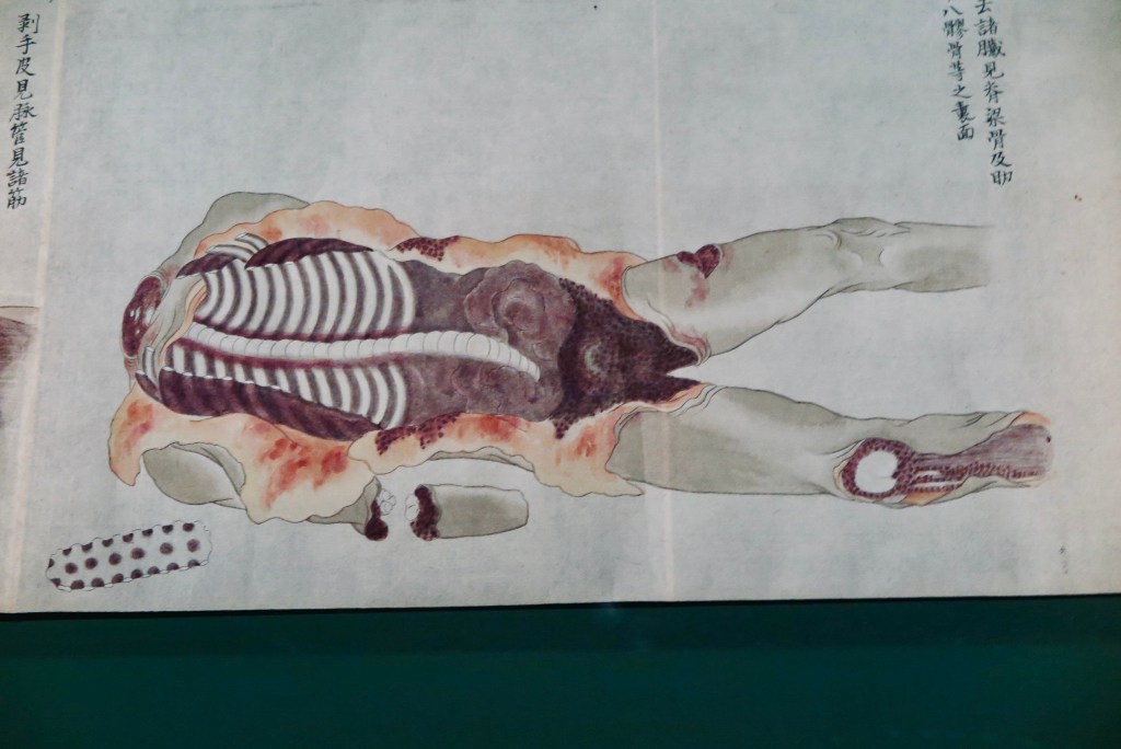En fin de parcours, là où médecine occidentale et orientale se rencontrent et finissent par s’inspirer mutuellement, vous avez un aperçu de ces échanges et notamment un immense rouleau japonais décrivant l’autopsie d’un cadavre, ancien condamné à mort, et inspiré de la médecine occidentale.